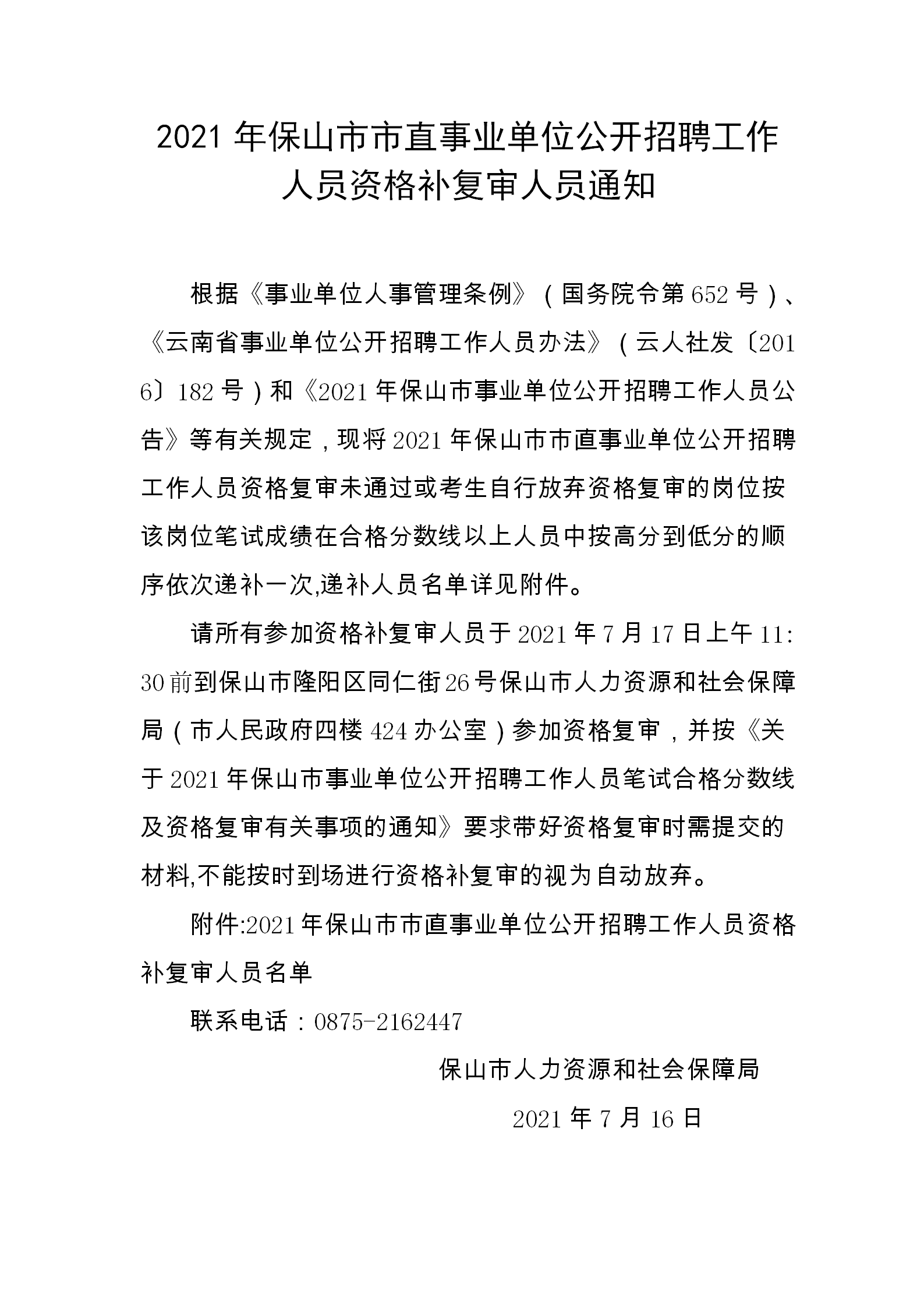 2021年保山市市直事业单位公开招聘工作人员资格补复审人员通知