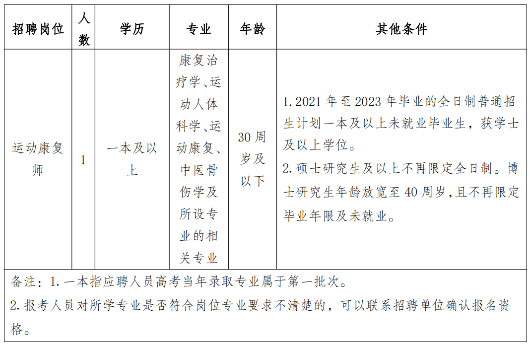 根据《中共保山市委组织部中共保山市委机构编制委员会办公室保山市人力资源和社会保障局关于进一步规范我市事业单位到校园招聘工作人员有关事项的通知》(保人社联[202018号)等规定,经保山市教育体育局、保山市人力资源和社会保障局同意,决定保山市青少年业余体校2023年校园公开招聘运动康复师1名。现将有关事项公告如下,