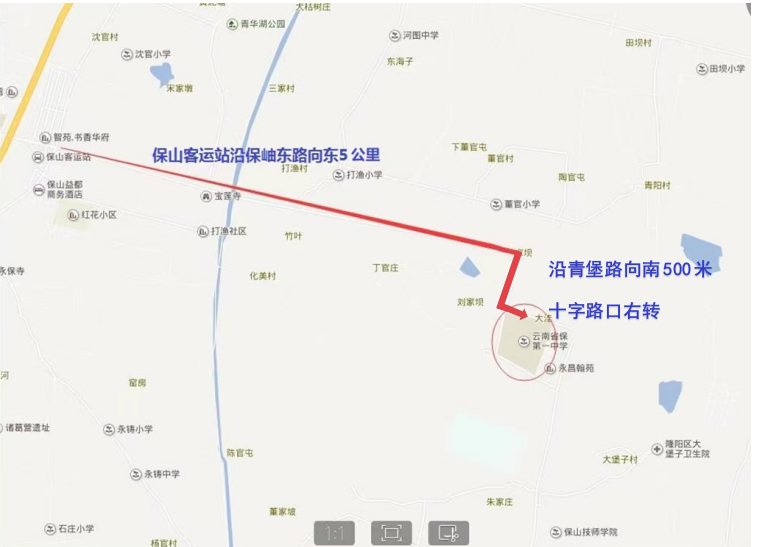 2.保山第一中学考点,地址:云南省保山市隆阳区永盛街道保山一中新校区,考生可乘坐7路、8路、10路、11路公交车到达。(首末班时间6:00—19:30)