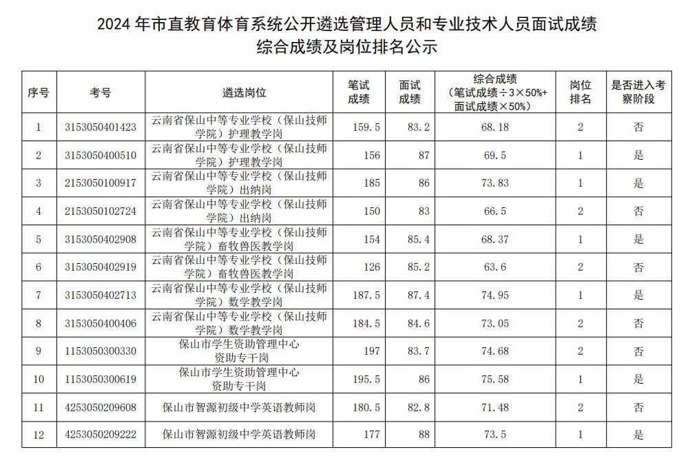 根据《2024年保山市市直事业单位公开遴选管理人员和专业技术人员的公告》等有关规定,现将2024年市直教育体育系统公开遴选管理人员和专业技术人员面试成绩、综合成绩、岗位排名情况公示如下,如有异议,请及时向保山市教育体育局反映。