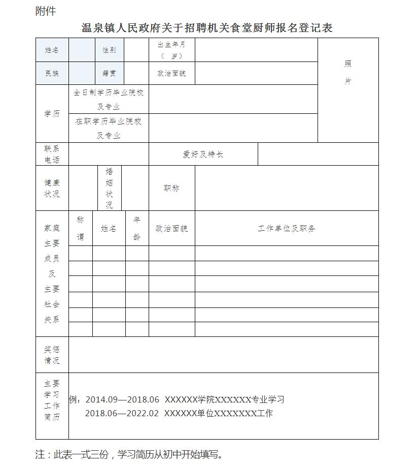 2.报名人员需填报《报名登记表》,应聘人员提供有效居民身份证、户口簿、相关资格证书等所需证件原件及复印件,有相关工作经历的需提供所在单位出具的书面证明或劳动合同,并提交近期免冠二寸彩色照片2张,通过以下两种方式报名: (1)网上报名:邮箱wqrsbgs@163.com (2)现场报名:温泉镇人民政府党政办公室