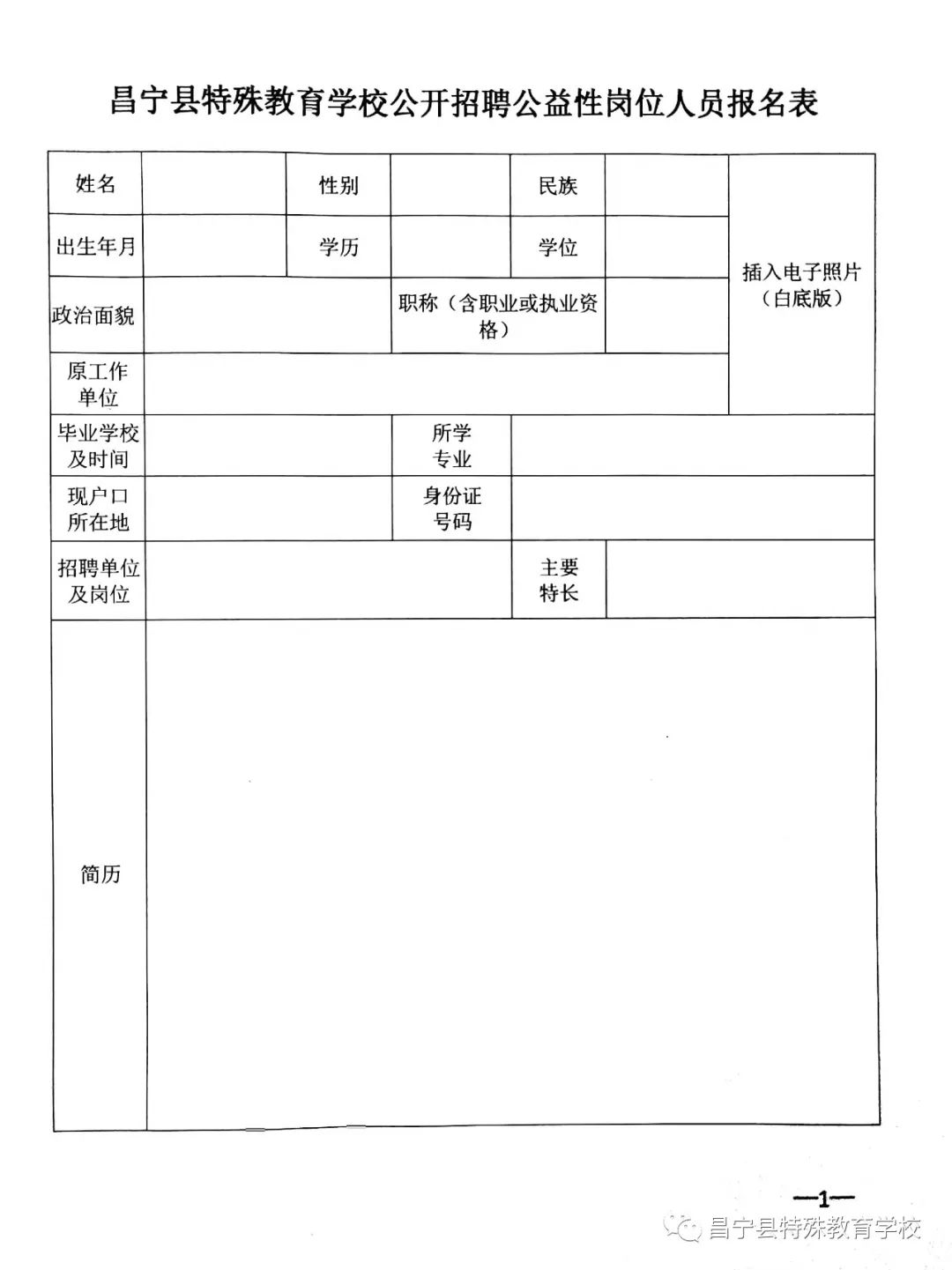 在报名时间内与学校领取《昌宁县特殊教育学校公益性岗位报名表》;联系人:周老师15906916971。