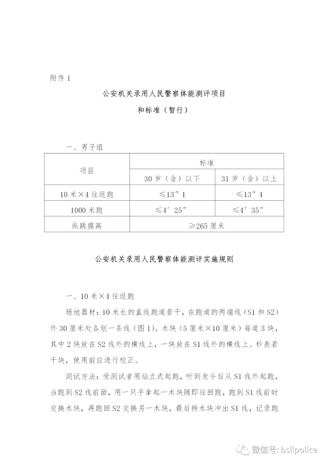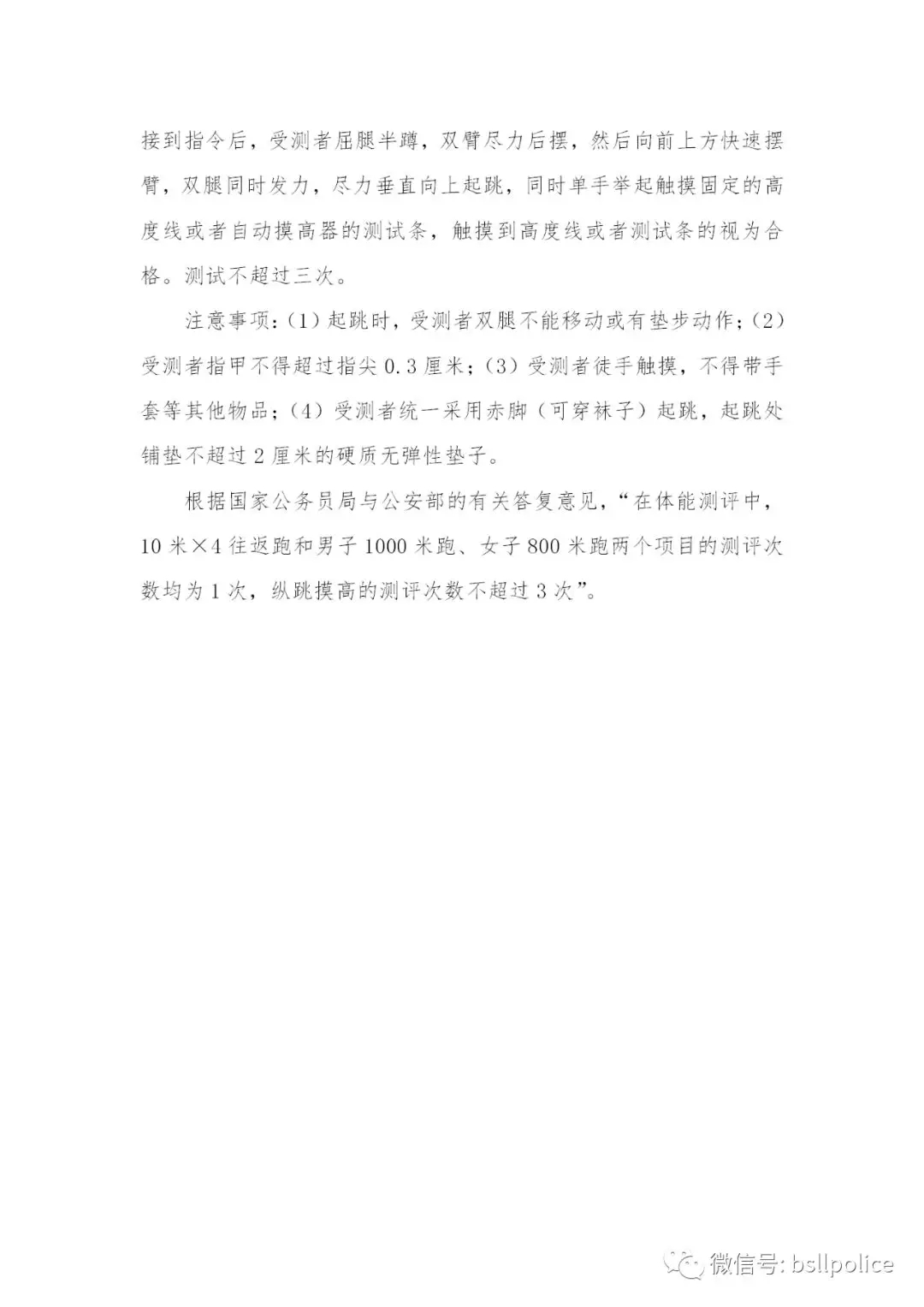 资格审查合格的报考人员在各自报名点所属县(市、区)公安局参加体能测评。体能测评参照《公安机关录用人民警察体能测评项目和标准(暂行)》执行,测评项目为“4×10米往返跑”、纵跳摸高、1000米跑(男子)。体能测试的合格标准附后。体能测评合格者方能进入后续考录环节。体能测评时间和地点另行通知。