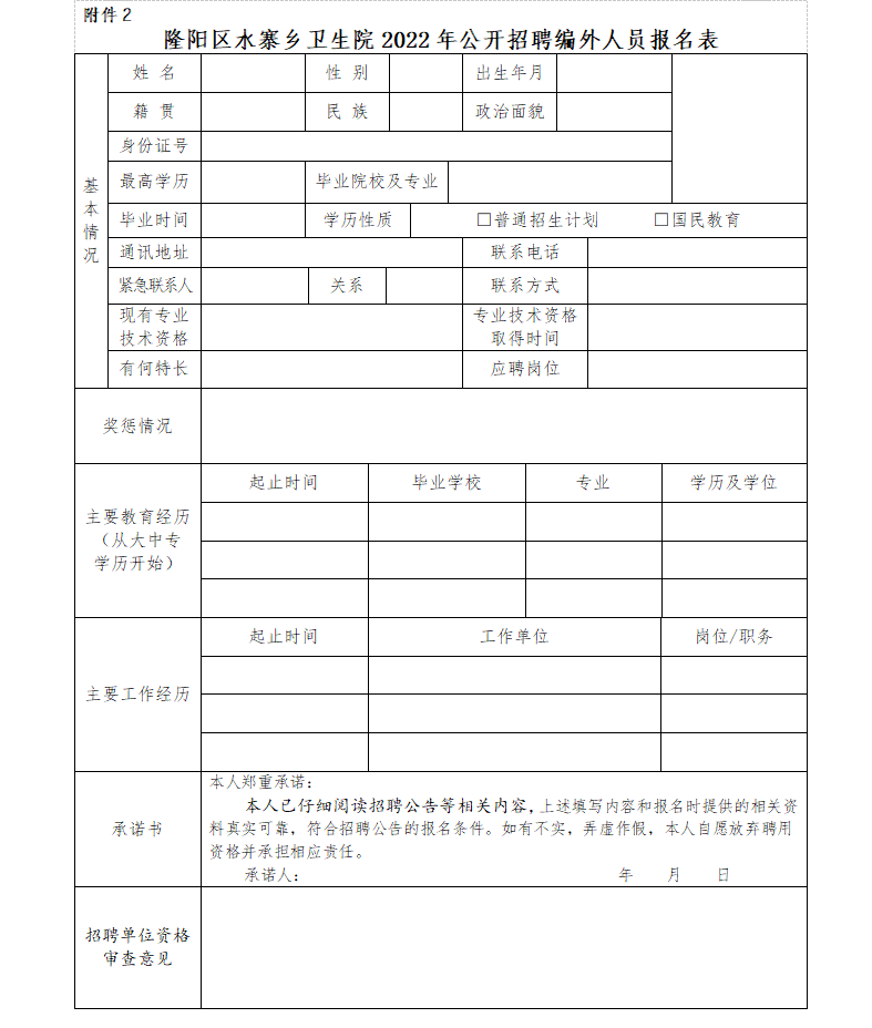 附件2.隆阳区水寨乡卫生院2022年公开招聘编外人员报名表