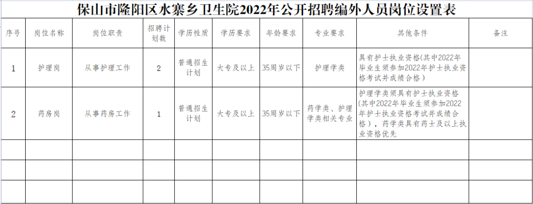本次招聘人数为3人,具体岗位情况详见《隆阳区水寨乡卫生院2022年公开招聘编外人员岗位设置表》(附件1)