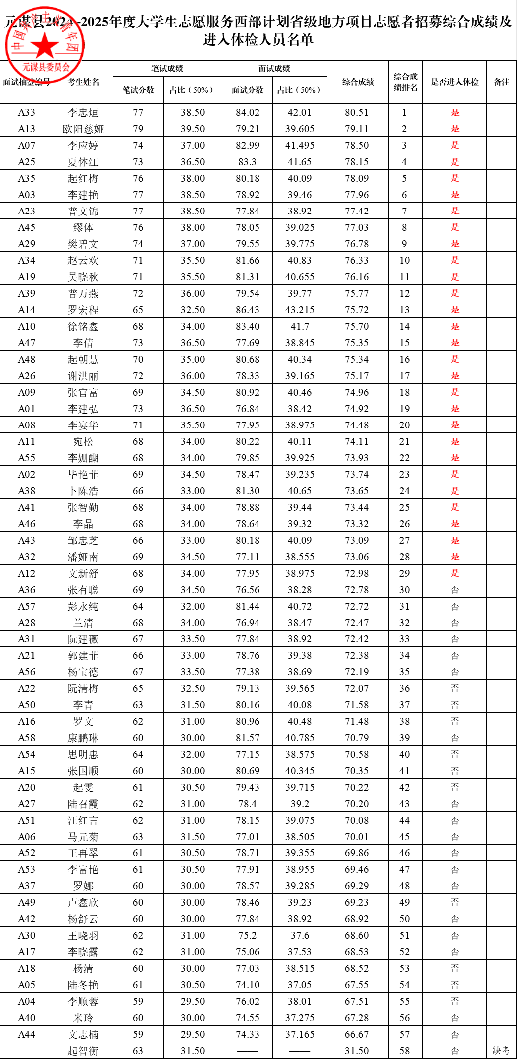 根据共青团云南省委、云南省教育厅、云南省财政厅、云南省人力资源和社会保障厅《关于印发〈2024—2025年度云南省大学生志愿服务西部计划实施方案〉的通知》和云南省大学生志愿服务西部计划项目管理办公室《关于做好2024—2025年度云南省大学生志愿服务西部计划地方项目志愿者招募派遣工作的通知》要求,元谋县2024—2025年度大学生志愿服务西部计划地方项目志愿者招募考试工作已经结束,各报考人员综合成绩的计算方法是:综合成绩=笔试成绩×50%+面试成绩×50%。笔试、面试均采取百分制计分,综合成绩保留小数点后2位。经核准,本次面试共有6名考生自愿放弃,按照不低于1:2的面试比例要求,依次递补2名考生参加面试,共有58名考生参加面试,现将元谋县2024—2025年度西部计划大学生志愿服务省级地方项目志愿者考试综合成绩排名及拟进入体检人员有关事项公告如下: