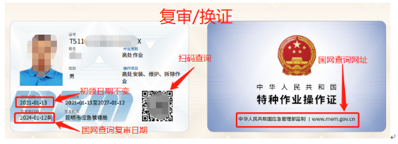 复审:高处作业、低压电工、焊工、高压电工