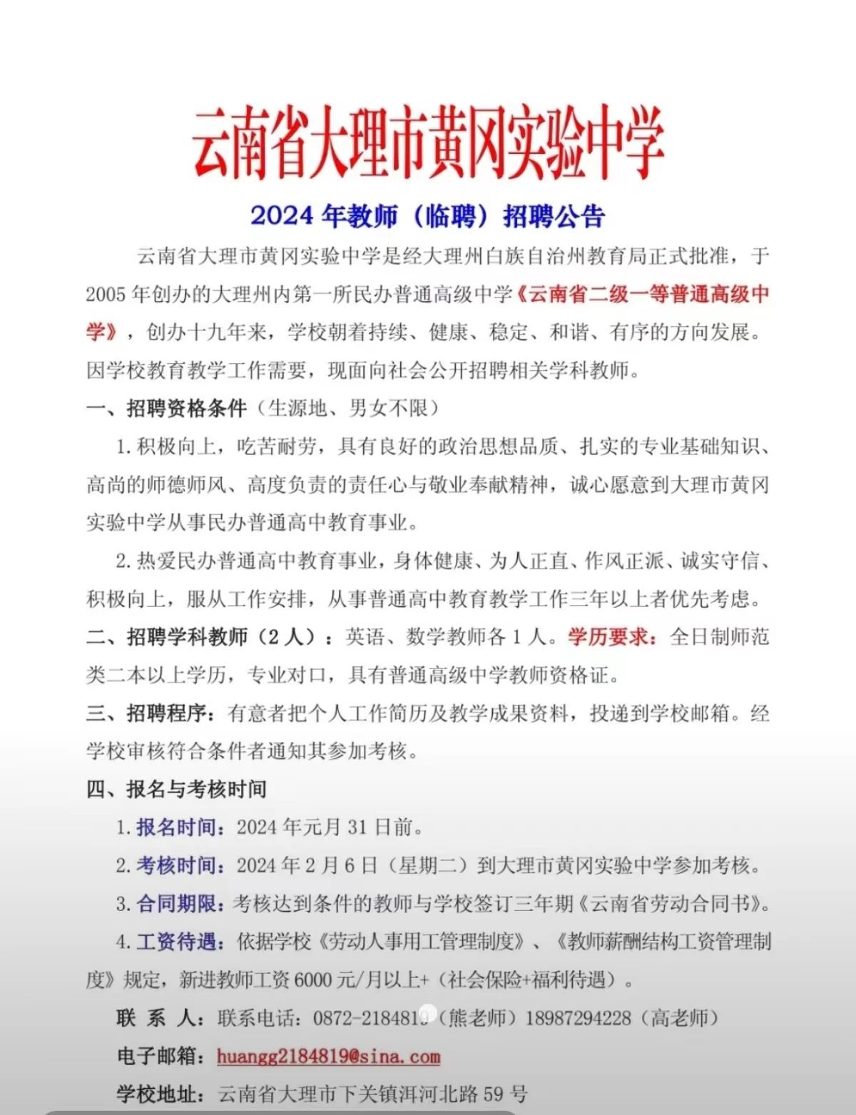 云南省大理市黄冈实验中学2024年教师(临聘)招聘公告