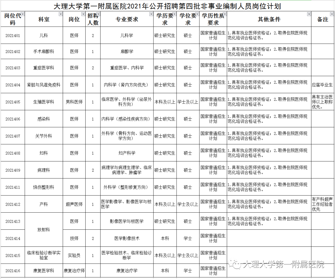 (1)报考人员可根据所学专业、学历等按照大理大学第一附属医院所需岗位的招聘条件进行报名。