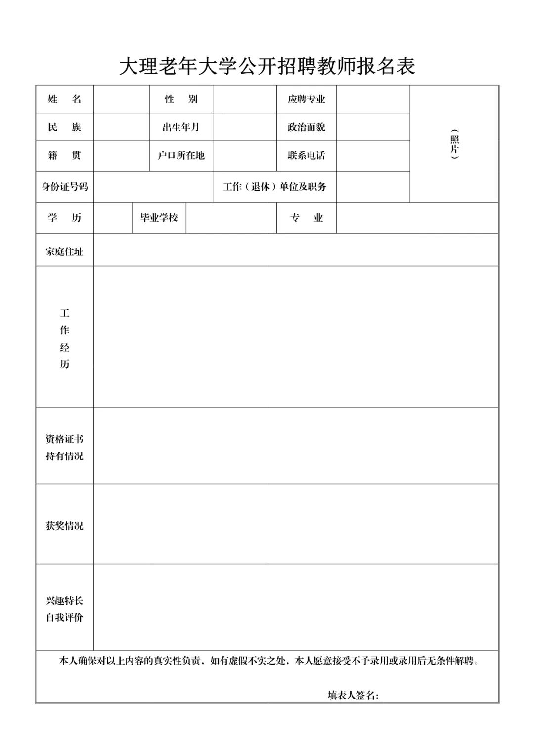 1.应聘教师可在本文下方下载保存《大理老年大学公开招聘教师报名表》,发送至电子邮箱dllndx@163.com,也可以到大理老年大学2楼办公室现场填报。(地址:大理市洱河北路46号黑龙桥旁)