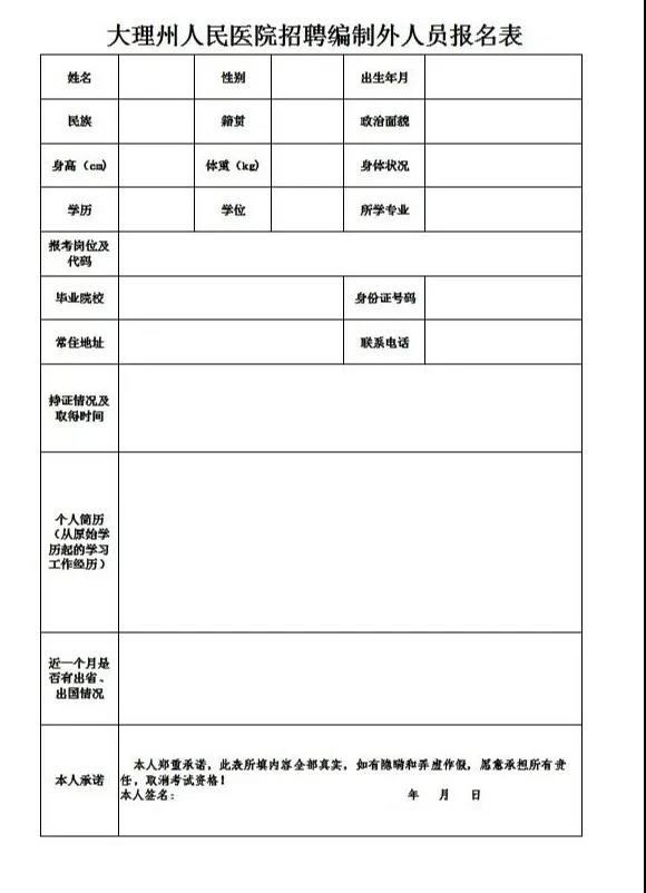 3、报名注意事项:报名人员须对照岗位要求,如实填写《大理州人民医院招聘编制外人员报名表》,笔试前招聘工作组将对参加考试人员进行资格复审,凡有弄虚作假、个人信息不一致、不符合岗位要求者,取消考试资格。