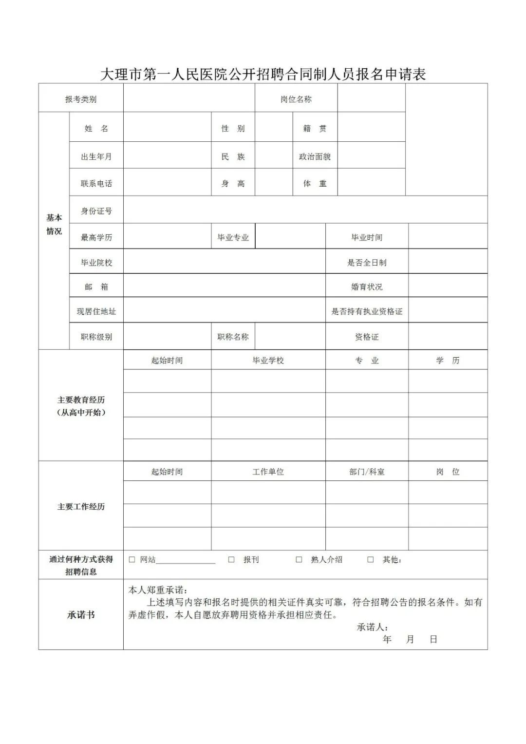 附件:大理市第一人民医院公开招聘合同制人员报名申请表