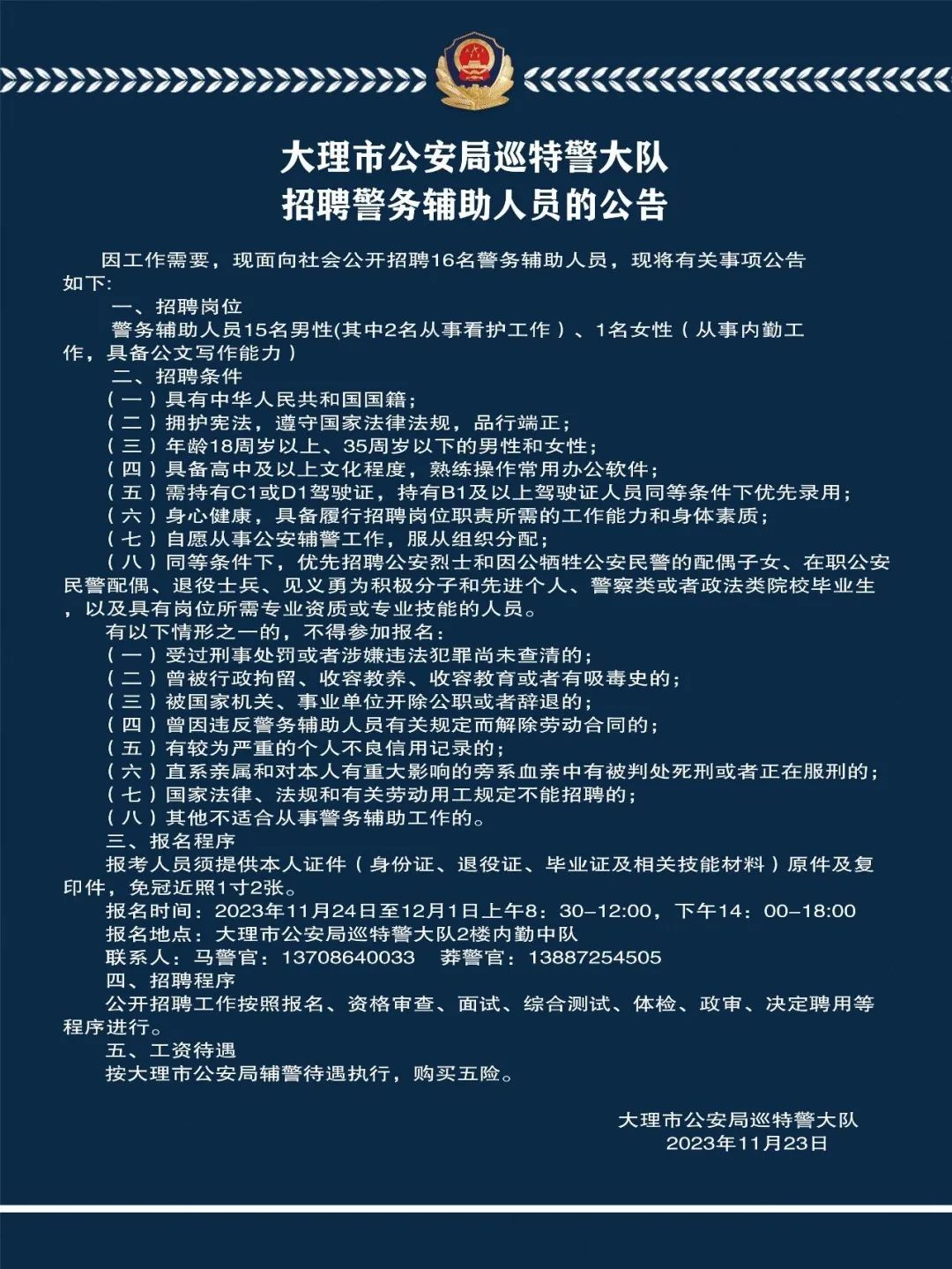大理市公安局巡特警大队招聘警务辅助人员的公告