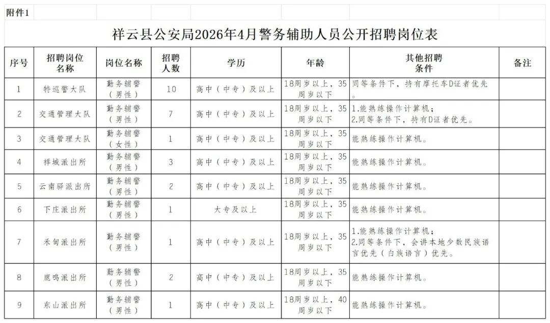 1.祥云县公安局2026年4月警务辅助人员公开招聘岗位表
