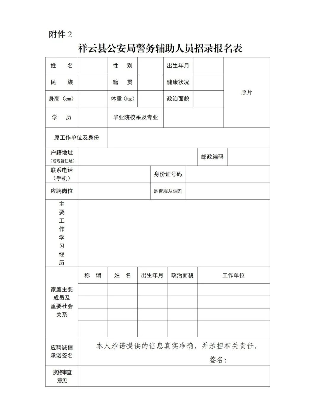 4.报名材料:(1)《祥云县公安局警务辅助人员招录报名表》1份(附照片);