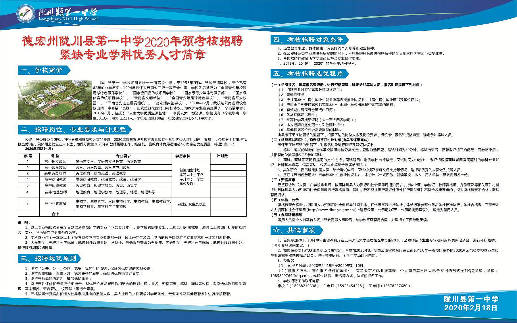 经陇川县委编委会研究,按照县机构编制办公室的要求,2020年教育系统考核招聘紧缺专业学科优秀人才计划已上报州上,今年县上共批准我校选优9名,具体州上批复还未下达,为做好我校2020年新教师招聘工作,结合陇川县教育体育局通知精神,确保选优的质量,特通知如下: