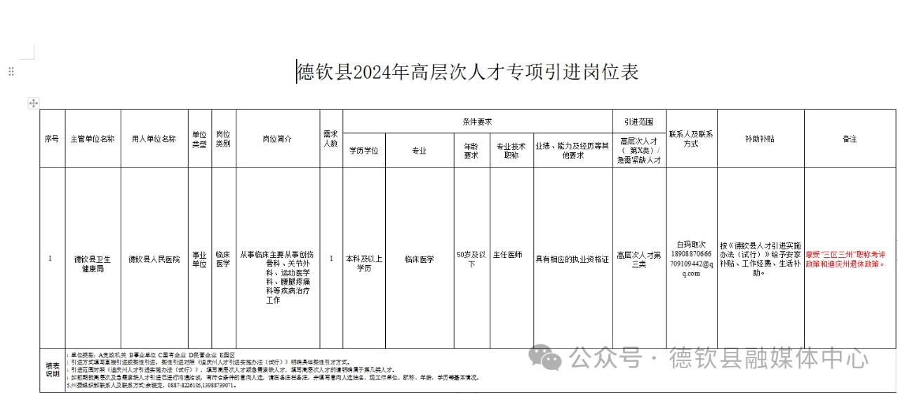 附件:1.德钦县2024年高层次人才专项引进岗位表