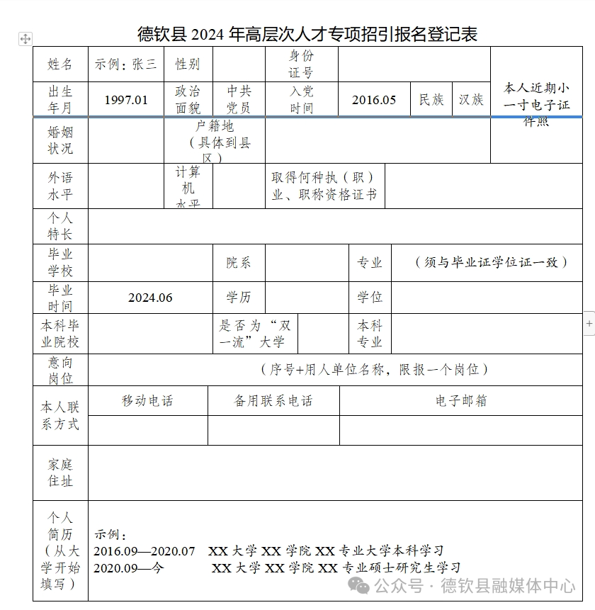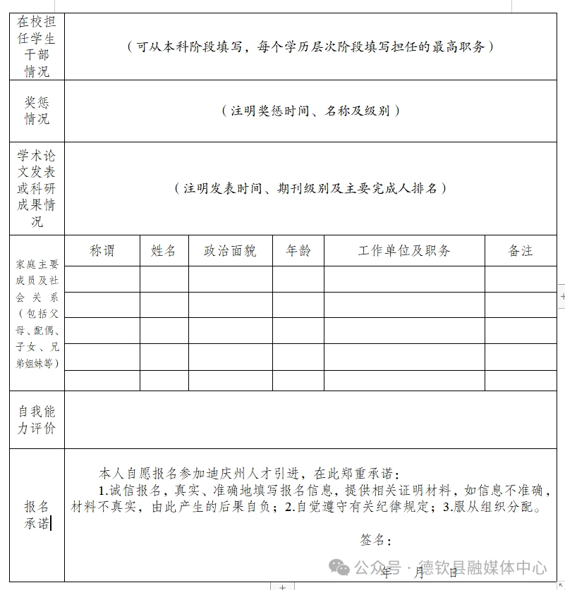 报名时间:2024年4月16日起至2024年4月23日(以发送报名申请时间为准)。报名采取个人自愿和组织推荐相结合的方式,报名人员填写《德钦县高层次人才引进报名登记表》(以下简称《报名登记表》),连同本人身份证、毕业证、学位证、奖惩情况、文稿发表情况、岗位要求的相关职称、经历业绩、单位同意推荐等相关证明材料,以拍摄或扫描的方式制作成电子文档(格式为JPG或PDF,图像清晰),打包压缩后上传至用人单位指定邮箱(邮箱地址见附件1)。邮件标题固定格式为:“引进单位+学校+专业+姓名”(如:德钦县人民医院+XX大学+临床医学+张三)。不符合引进对象资格条件的视为无效报名。报名不收取任何费用,报名和资格初审同步进行。每名报考人员只能报考一个岗位。报考人员对岗位表中有关岗位的学历、学位、专业等招聘条件有疑问需要咨询的,请于报名前在工作时间内及时与招聘单位联系(联系方式见附件1)。所学学科专业不在选定的参考目录中,但与岗位所要求的学科专业类同的拟报考人员,可以主动联系招聘单位确认报名资格。