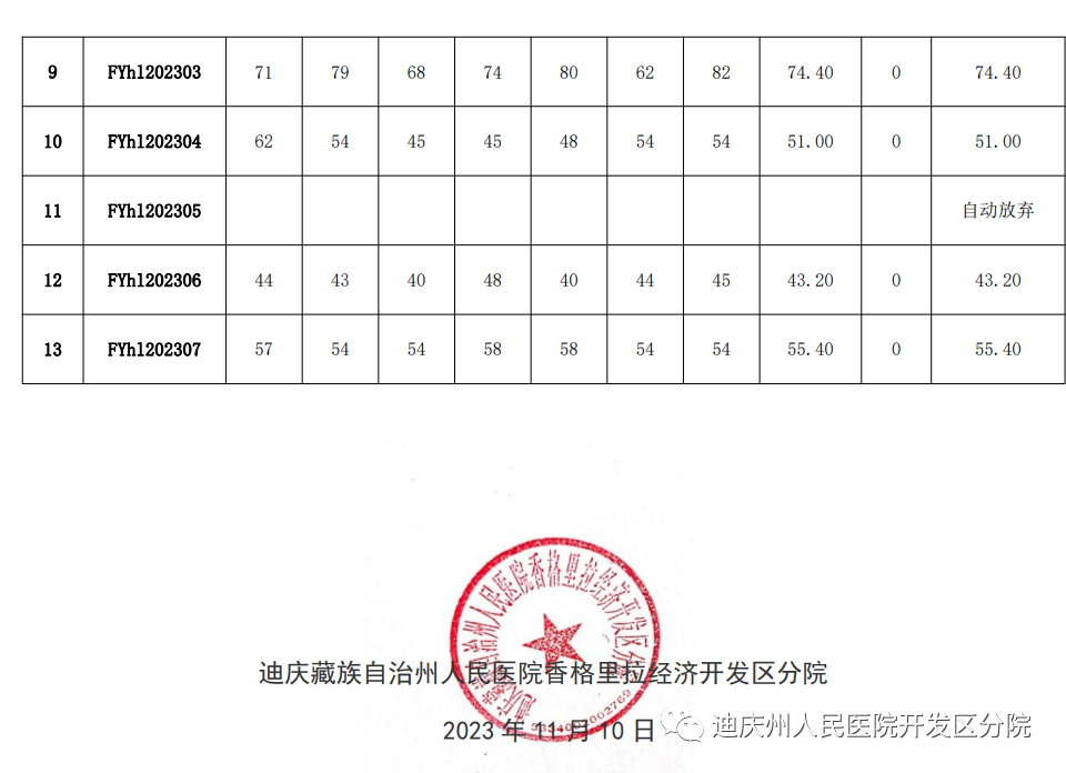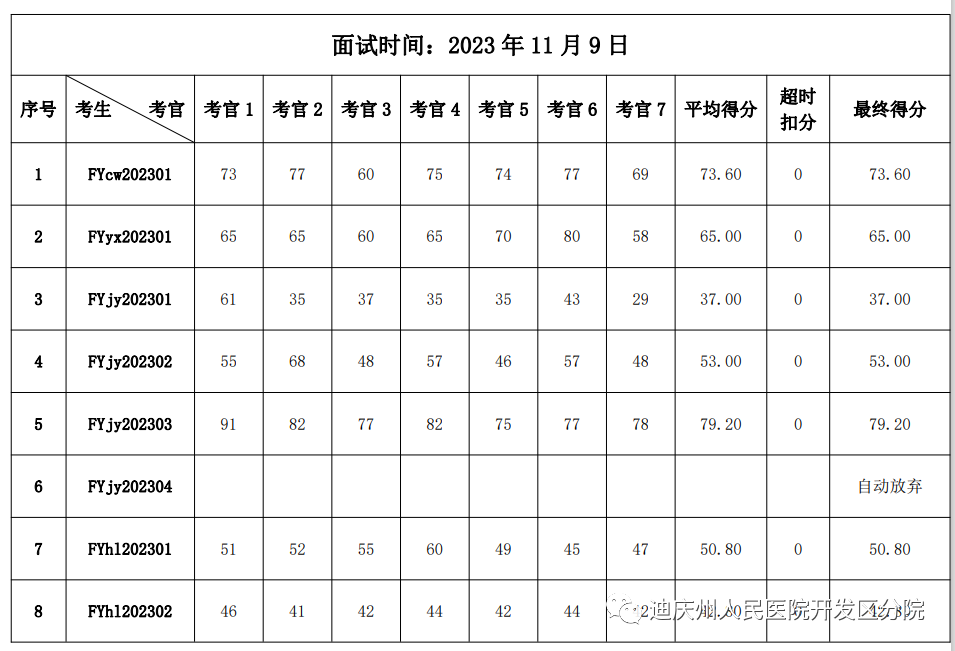 按照《迪庆州人民医院开发区分院关于招聘编外工作人员的公告》的要求现将面试人员及面试成绩公示如下:1、公示期:2023 年 11月 10 日至 11 月 17 日,对面试成绩如有异议的请在公示期间内向迪庆州人民医院香格里拉经济开发区分院综合办公室反映,公示期过后提出一律不予受理。联系电话:0887-8388115