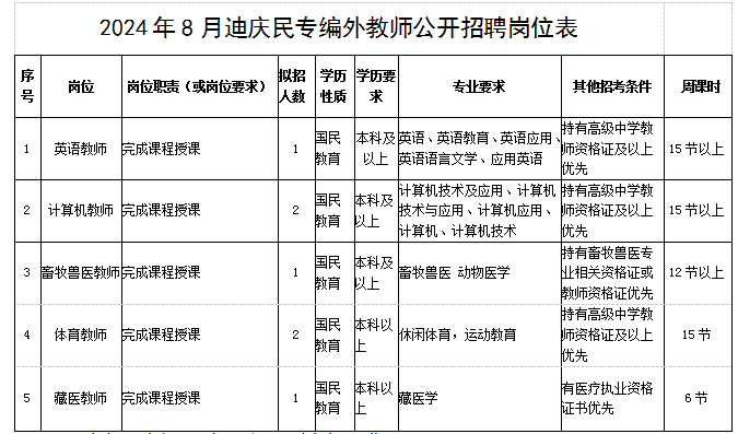 因学校工作需要,迪庆州民族中等专业学校面向社会公开招聘7名编外教师、3名宿舍管理人员、2名教官人员、1名心理咨询室的外聘教师,现将有关事项公告如下: