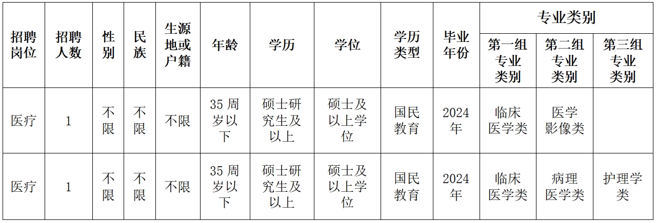 高等院校医学类本科及以上学历毕业后直接参加国家计划内住院医师规范化培训,2024年国家住院医师规范化培训合格且具有国家执业医师资格,参加医疗卫生行业招聘医学类岗位的,视为2024年度应届毕业生(资格复审时须提供成绩单、合格证明,否则取消聘用资格)。