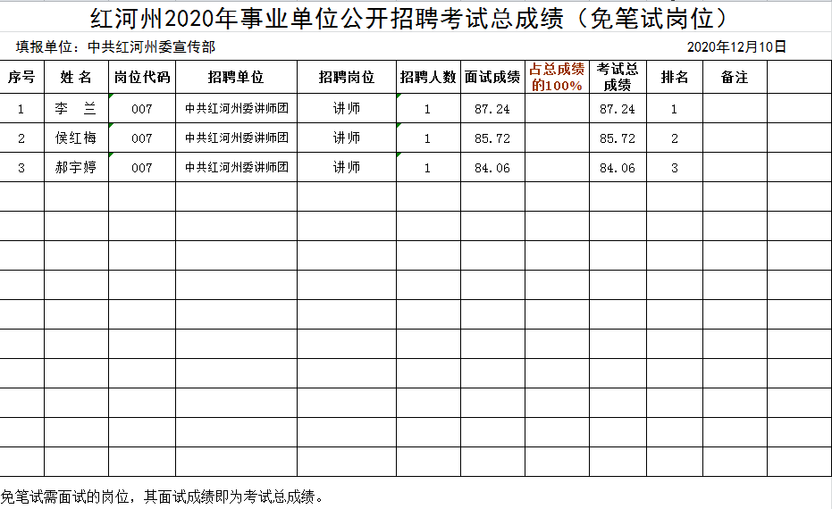 2020年中共红河州委宣传部事业单位招聘总成绩(州委讲师团)
