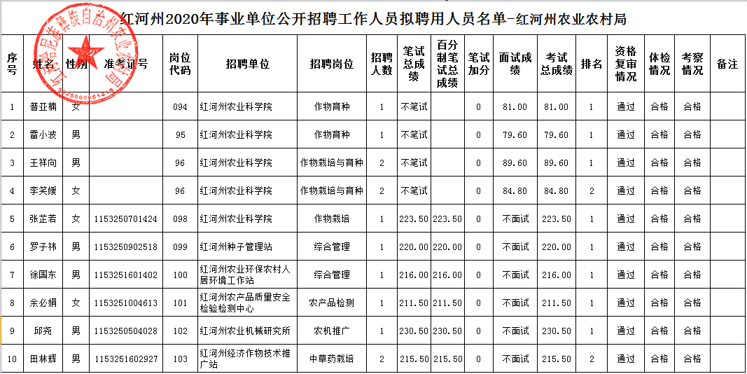 红河州农业农村局2020年事业单位公开招聘拟聘用人员名单(公示期:2020年12月25日—2021年1月5日).xls