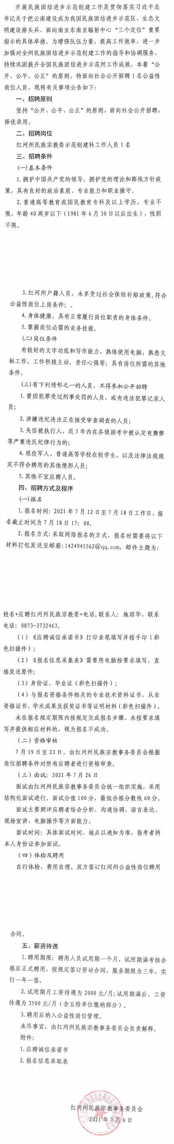 红河州民族宗教事务委员会关于招聘公益性岗位工作人员的公告