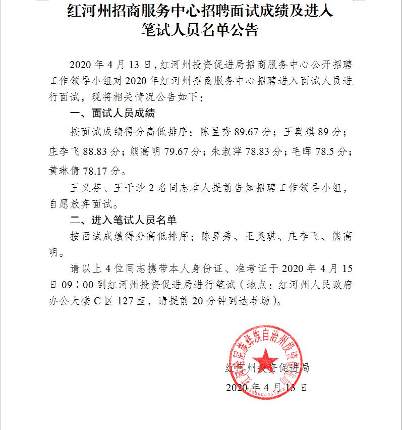 红河州招商服务中心招聘面试成绩及进入笔试人员名单公告