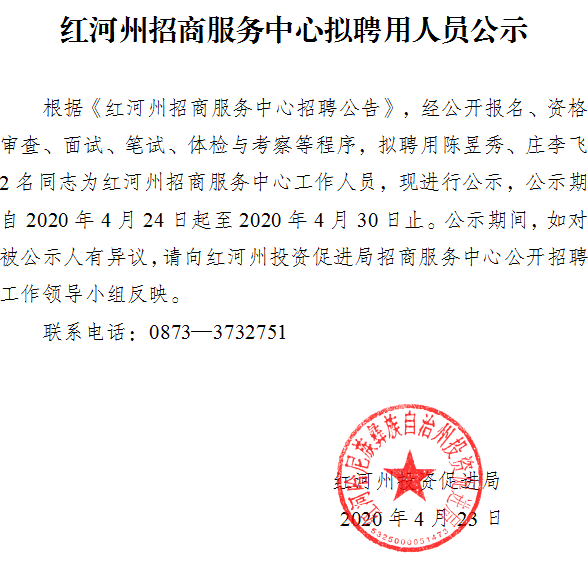 红河州招商服务中心拟聘用人员公示