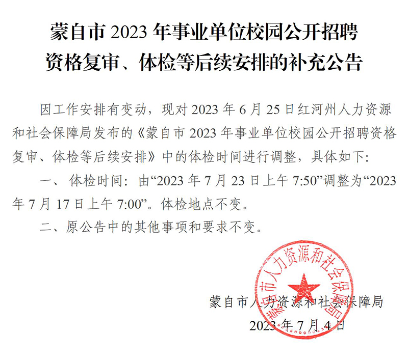 蒙自市2023年事业单位校园公开招聘资格复审、体检等后续安排的补充公告