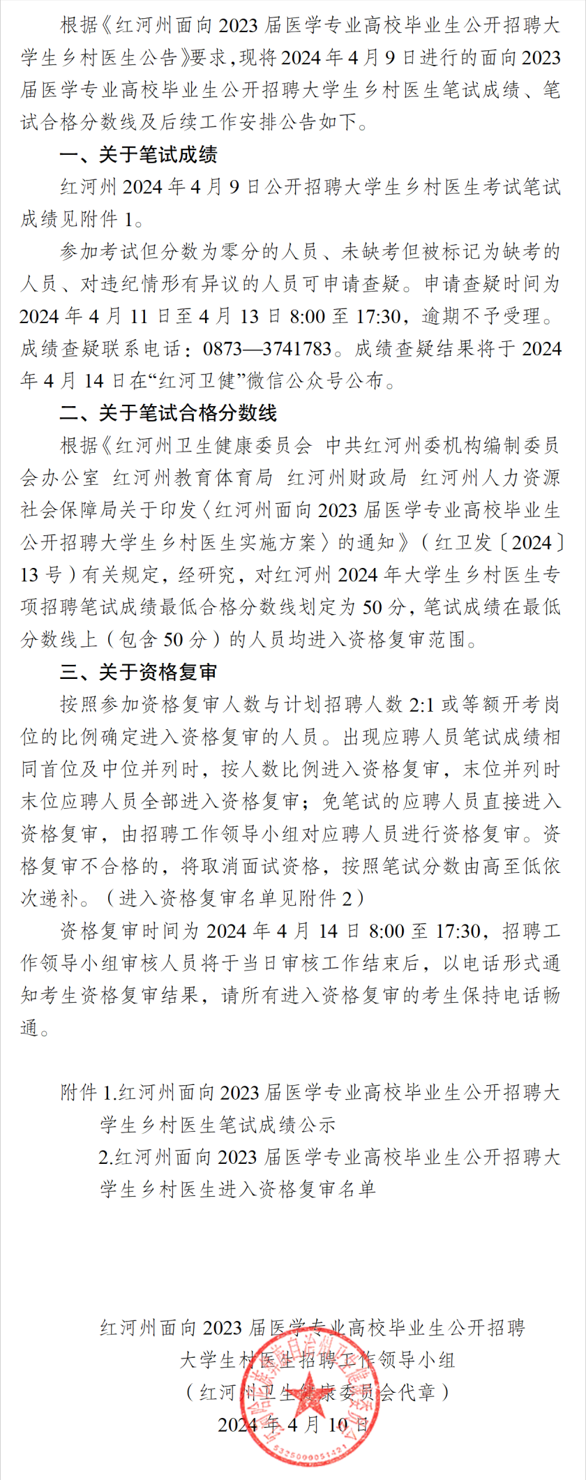 附件1:红河州面向2023届医学专业高校毕业生公开招聘大学生乡村医生笔试成绩公示.xls