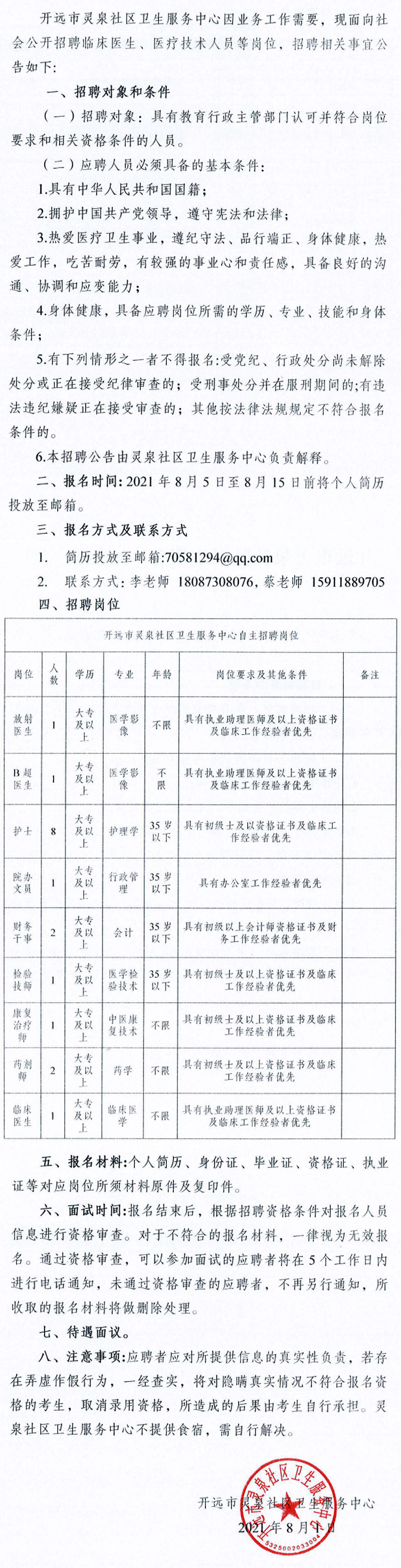开远市灵泉社区卫生服务中心招聘公告