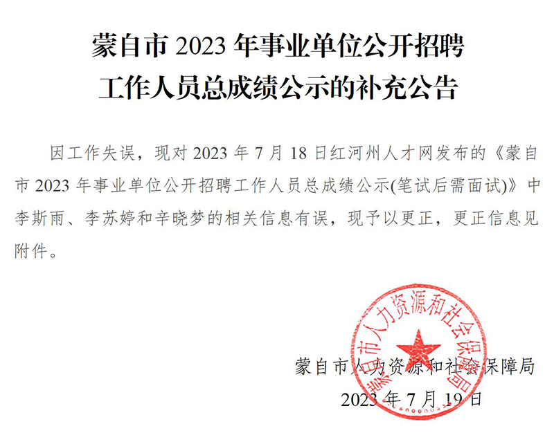 蒙自市2023年事业单位公开招聘工作人员总成绩公示的补充公告