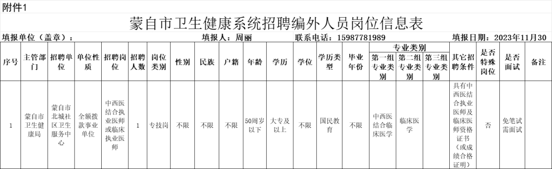 具体详见《蒙自市北城社区卫生服务中心招聘编外人员岗位信息表》(附件1)。