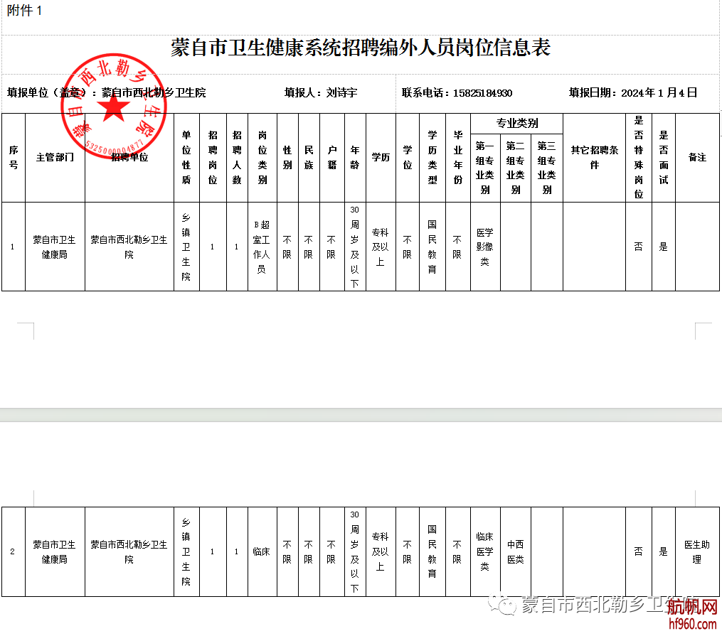 具体详见《蒙自市西北勒乡卫生院招聘编外人员岗位信息表》(附件1)。