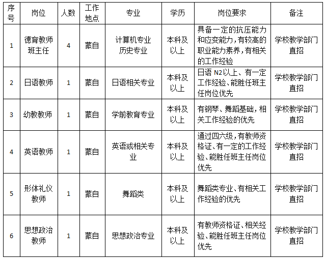 备注:以上岗位均为学校直招的教学岗位,非招生岗或其它岗位。面试合格后,入职参加培训,合格后马上上岗。
