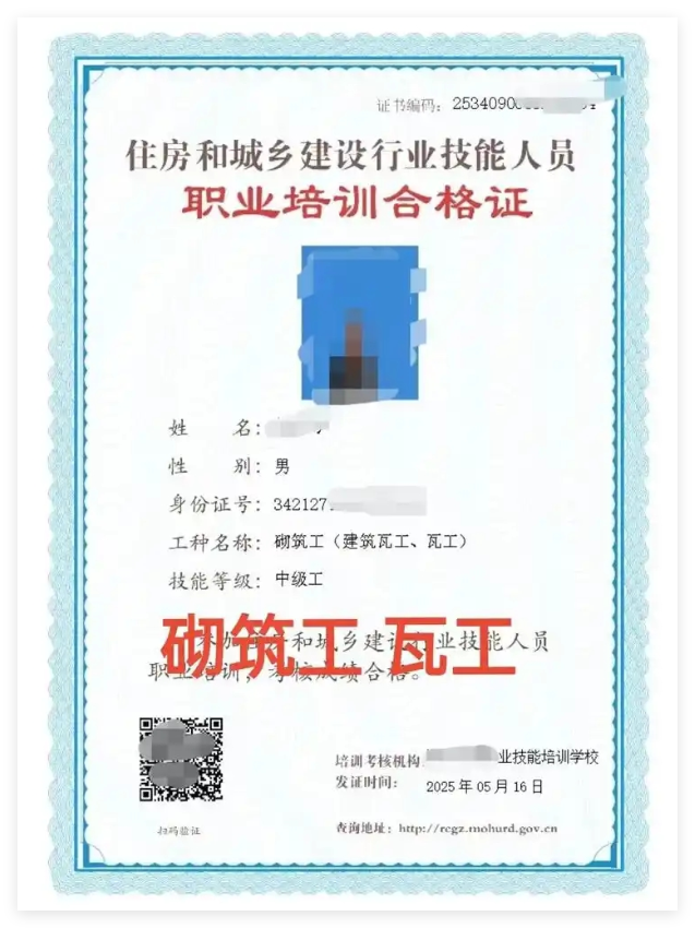 建筑类普工证:涵盖砌筑工、钢筋工、木工、抹灰工等工种,用于建筑企业资质申报、工程招投标及施工资质审核,是施工企业合规用工的必要证明。