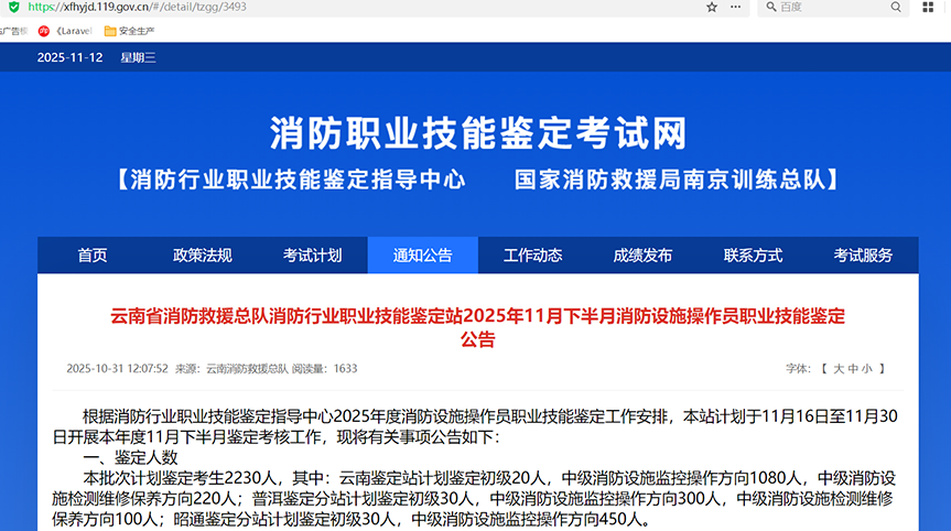 云南省消防救援总队消防行业职业技能鉴定站2025年11月下半月消防设施操作员职业技能鉴定公告
