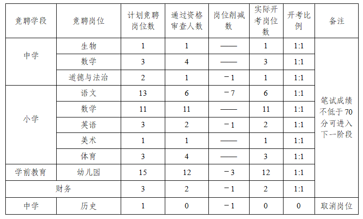 2023年东川区教育系统内空岗竞聘现场报名、资格审查后,有部分岗位未达到笔试开考比例,根据《2023年东川区教育系统内空岗竞聘公告》中“每个竞聘岗位报名人数开考比例为1:2,根据报名情况和教师紧缺程度,经批准后,可降低开考比例,笔试成绩不低于70分可进入下一阶段”的规定,经研究批准,将部分岗位笔试开考比例由1:2降至1:1,部分岗位降低开考比例后仍未达到1:1要求的削减竞聘岗位,无人报考的岗位将取消,具体情况如下:
