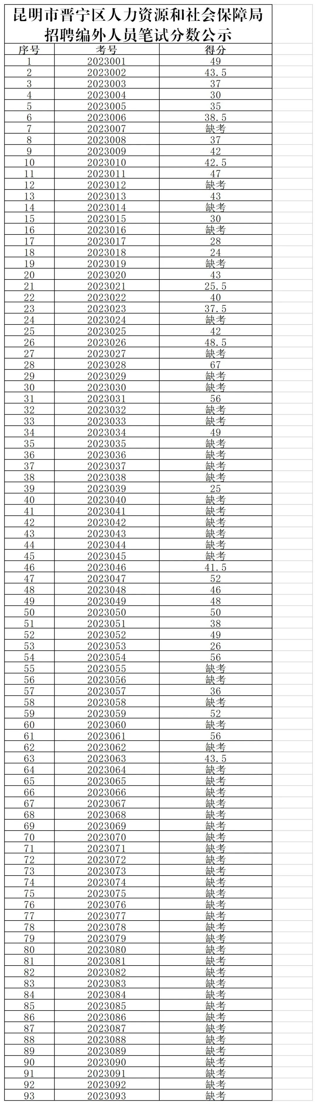 因工作需要,昆明市晋宁区人力资源和社会保障局招录编外人员1名,前期报名94人,后期经过昆明市晋宁区人力资源和社会保障局招录领导小组审核报名情况,符合报考93人。2023年2月25日,经昆明市晋宁区人力资源和社会保障局组织笔试,现将笔试情况公示如下。公示期自2023年2月27日-2023年3月3日,联系电话:0871-67892377。