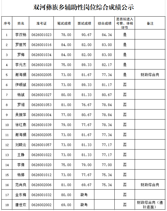 双河彝族乡招聘辅助性岗位综合成绩及拟进入考察、体检人员的通知