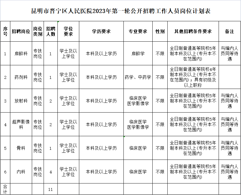 详见《昆明市晋宁区人民医院2023年第一轮公开招聘工作人员岗位计划表》。