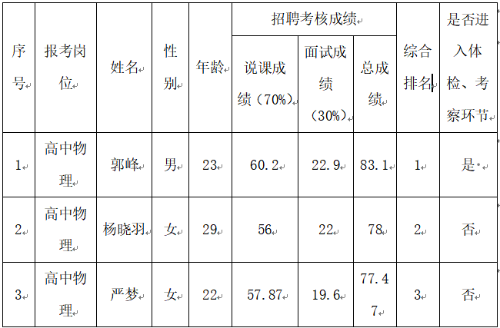 根据《昆明市晋宁区第二中学2023年公开招聘临聘教师招聘简章》,学校于2023年7月27日对报考我校高中物理教学岗位资格复审通过的3位教师进行说课、面试考核,郭峰以总成绩83.1分,综合排名第一,将进入体检、考察环节;具体情况公示如下: