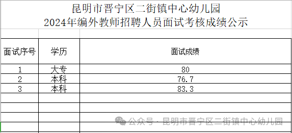 因工作需要,昆明市晋宁区二街镇中心幼儿园招聘编外人员2名,经前期报名审查,3名人员进入面试。2024年2月5日,经昆明市晋宁区二街镇中心幼儿园组织面试,现将面试考核成绩公示如下,公示期自2024年2月5日—2024年2月9日(5个工作日)。