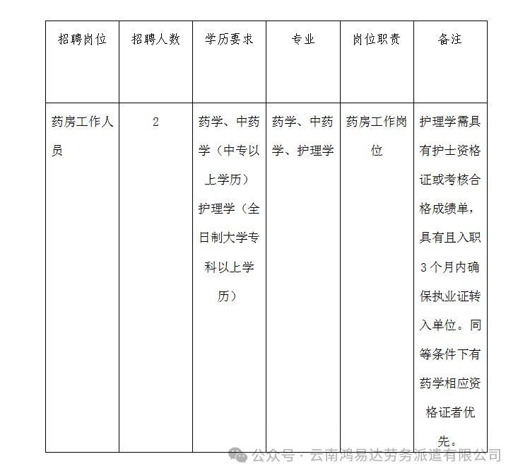 云南鸿易达劳务派遣有限公司根据晋宁区宝峰中心卫生院委托,面向社会招聘劳务派遣人员2名,具体如下: