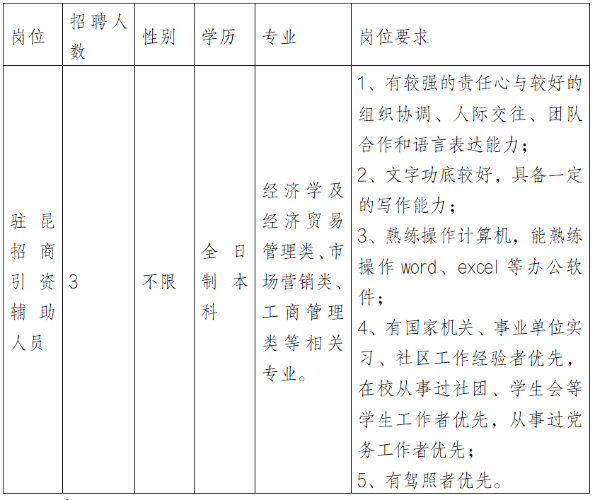 本次招聘合同制招商辅助人员共3人,具体招聘岗位及要求为: