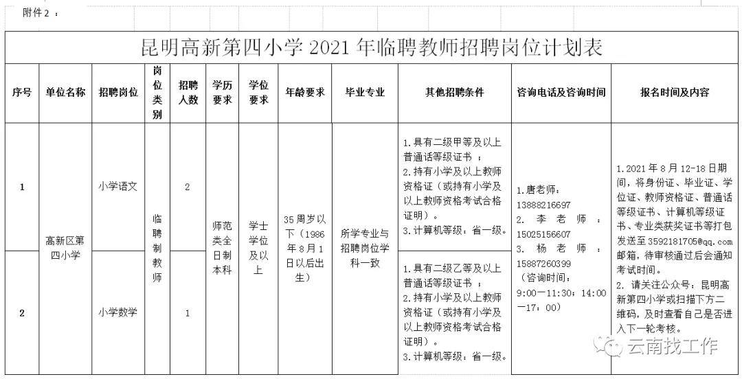附件2: 昆明高新第四小学2021年临聘教师招聘岗位计划表
