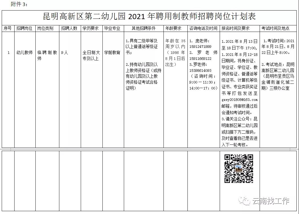 附件3: 昆明高新区第二幼儿园2021年聘用制教师招聘岗位计划表