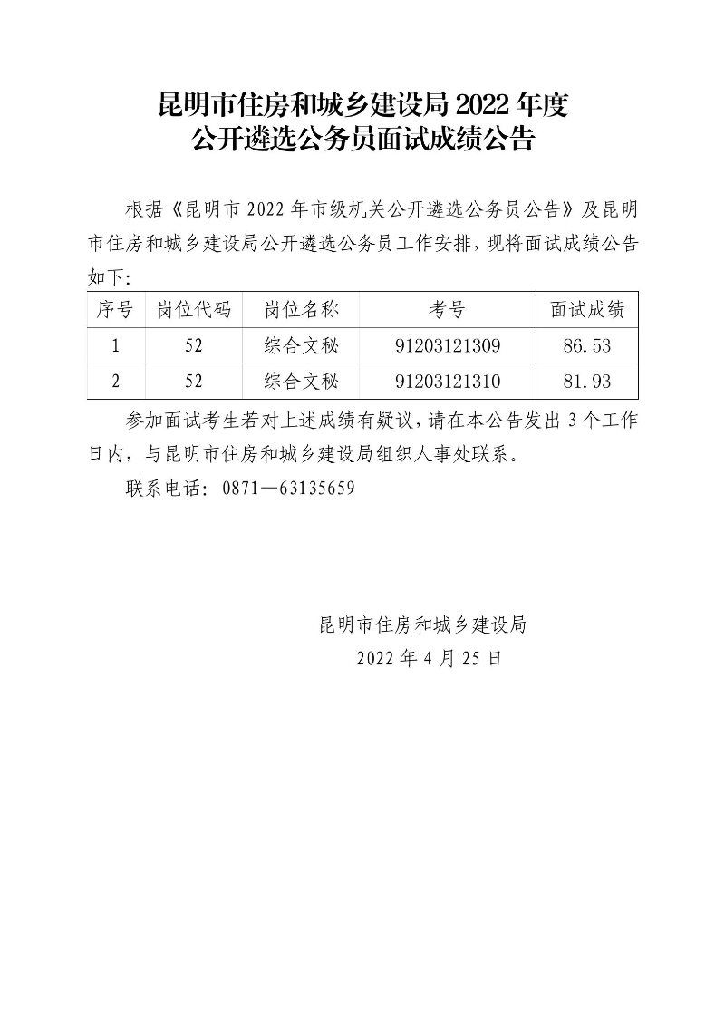 昆明市住房和城乡建设局2022年度公开遴选公务员面试成绩公告